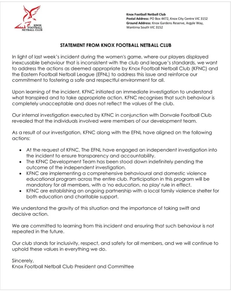 Statement from the Knox Football Club—makes me wonder where the President and Committee were on game day if they only learned about the incident from others…