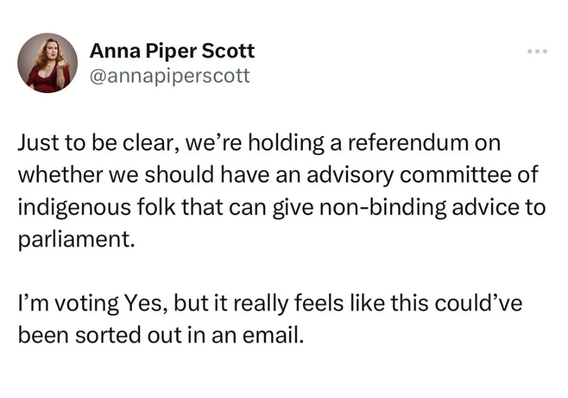 If I’m honest, I’ve questioned why the hell this is even a thing. I mean how horrendously appalling and embarrassing that this is not already part of the constitution. It’s 2023 and we are asking the permission of the predominantly white population of Australia if it’s OK if our First Nations People can please, pretty please, have a committee that advises government on anything that affects—you guessed it—First Nations People.