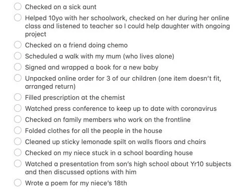 In lockdown, when things were particularly stressful for everyone, there was one day when I was so frustrated about the prioritisation of paid work over the family’s mental health I made a list of all the things I did that were outside recognised employment. They may have seemed small, but in the fabric of life at that time, they were the fibres holding us together. I won’t include the full list but some of it stands out to me because it comes under unpaid care.