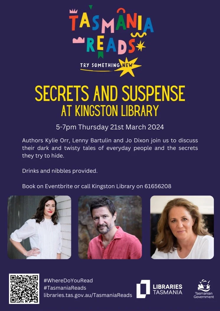 Author Talk with Jo Dixon Thursday 21 March 2024 5:00 pm 7:00 pm Kingston Library 11 Hutchins Street Kingston, TAS, 7050 Australia (map) Google Calendar ICS As part of TASMANIA READS … Jo Dixon and Kylie Orr talk all things writing: suspense thrillers, local settings, female-led stories and what draws them to the dark side. Booking Link here!